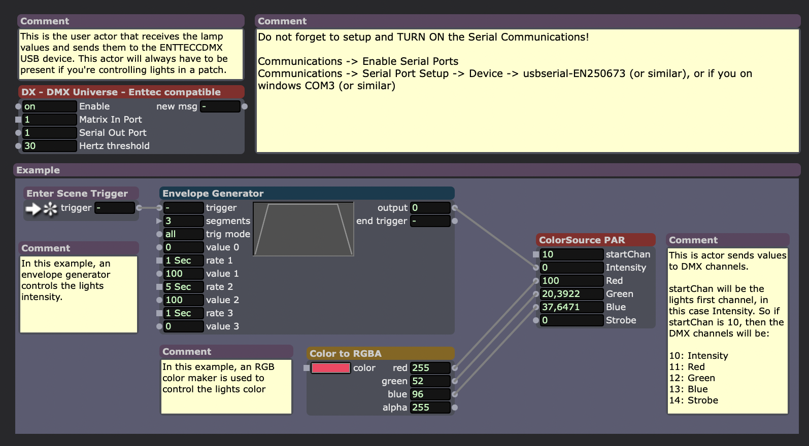 With this Isadora file you can control DMX lighting directly using an ENTECC DMX USB PRO